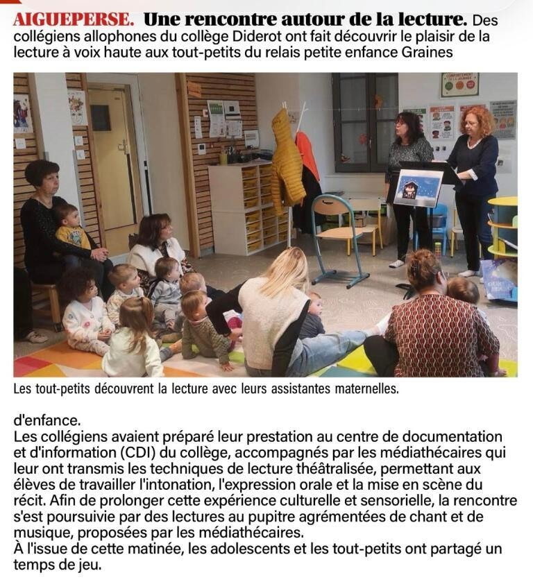 À Aigueperse, Sylvie et Patricia ont accompagné un beau projet mené avec le CDI du collège Diderot : des collégiens allophones ont offert aux tout-petits du RPE "Graines d'enfance" un moment de lecture à voix haute.